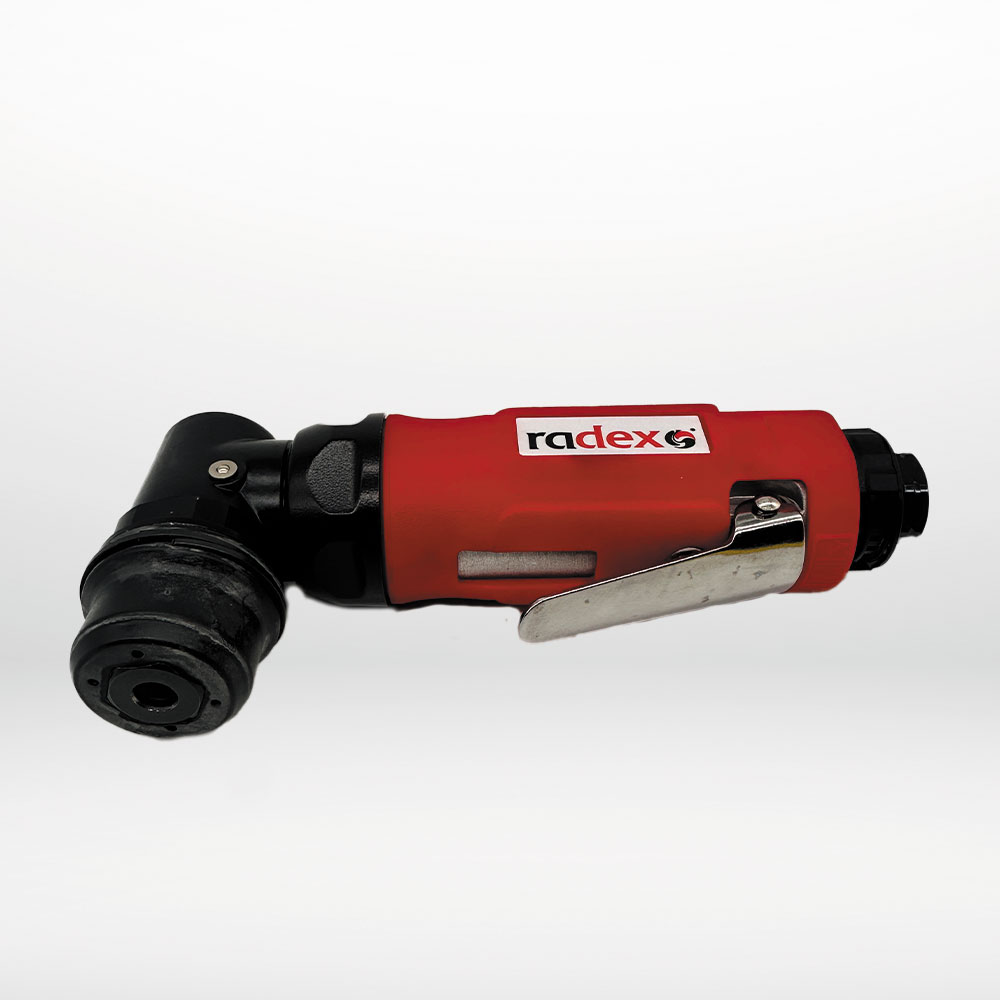 Ett pneumatiskt, vinklat mini-roterande verktyg avsett för rengöring och slipning i svåråtkomliga utrymmen, utrustat med en 30 mm stödplatta (excentricitet 2 mm).